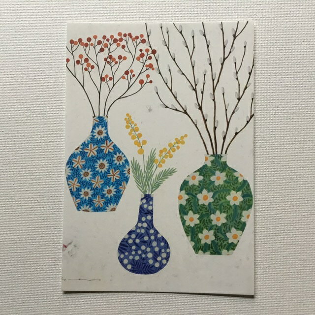 Yoko Matsumoto マツモトヨーコ ポストカード 「過ぎ去った季節」花柄の花瓶 ネコヤナギ 赤い実 ミモザ