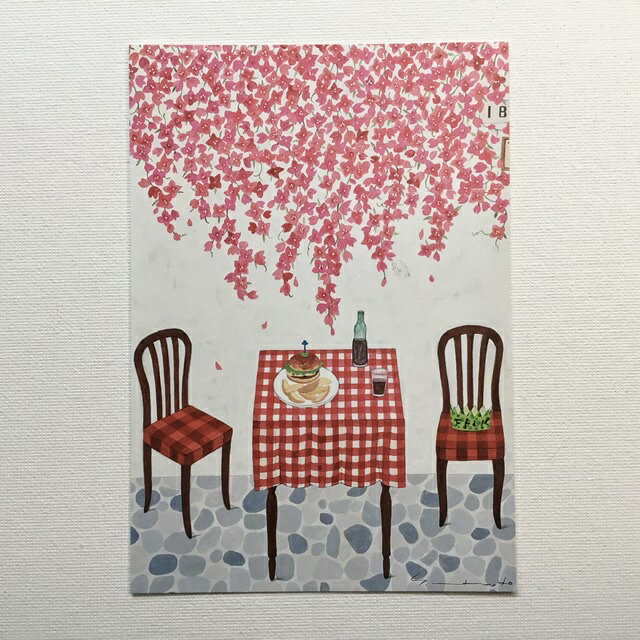 Yoko Matsumoto マツモトヨーコ ポストカード 「光の午後」赤い花 チェックのテーブルクロス テーブル チェア ハンバーガー 王冠