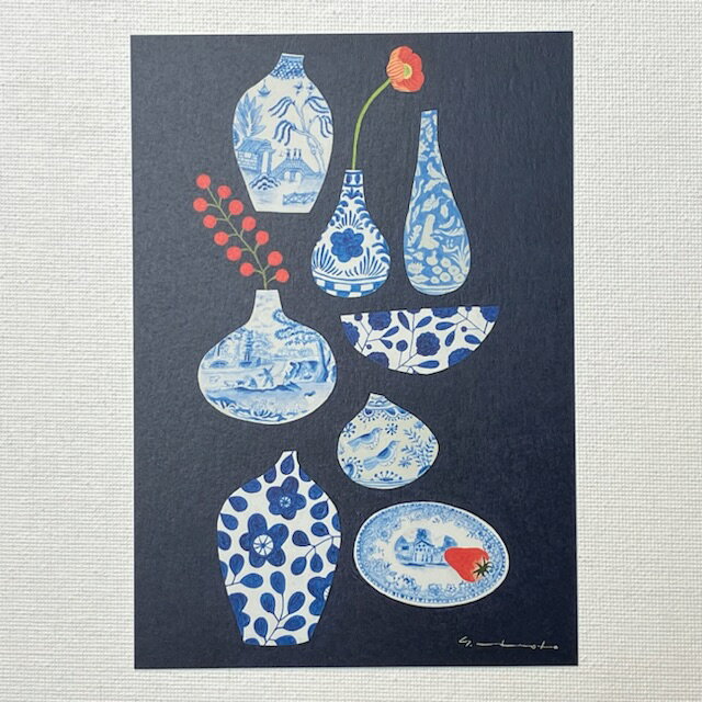 Yoko Matsumoto マツモトヨーコ ポストカード 「静かに深く」シノワズリ 花瓶 プレート ポピー 赤い実