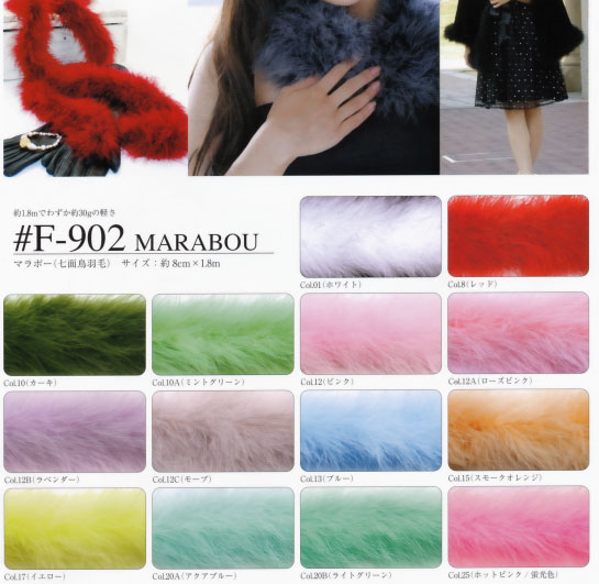 直径8cmぐらいのふわふわでかわいいマラボー 小物作りやドレス制作にも便利です。 品質:七面鳥の羽毛 直径:約8cm 長さ:約180cm 注意事項:商品の性質上、多少毛が抜けたり色落ちする可能性がございます。水鳥の羽毛を使ったマラボーのご紹介