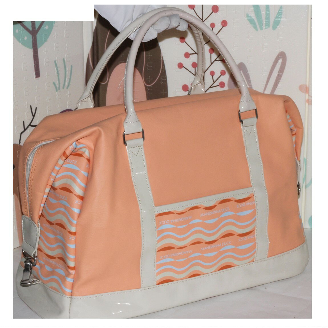 MANDARINA DUCKマンダリアダックのカラフルな波型模様が施されている収納力抜群のベージュ色ボストンバッグ兼旅行鞄の美品の出品です。サイズはW46H27D19cmで幅1,5cmの持ち手の長さは40cm位で付属品はございません。開閉部分はファスナー式で中はグレー色のナイロン素材で25cm位のファスナー付きポケットと本体正面にも18cm位のポケットがついています。脇の部分がホックを外すことによって模様が出るような作りになっています。さほど使用感の見られない綺麗な状態ですのでお勧めです。管理番号〇C19-177-1