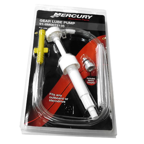 マーキュリーギアルーブポンプ【91-8M0072135】★946ml ギアオイル(92-858058K01)ボトル用のポンプとなります。 マーキュリー製 32oz(946ml)ボトルに取り付けて使用するギアオイル交換用のハンドポンプです。 付属のネジ山変換アダプターを併用することで、ほとんどのマーキュリー船外機及びスターンドライブのギアハウジングに適合します。 また、付属のネジ山変換アダプター使用し、ヤマハ・トーハツ・ホンダなどのM8-P1.25ネジサイズのギアケースに使用する事も可能です。(一部例外機種があります。) ◆ MERCURY 946ml(32oz)ボトル用 ◆ 対応ギアオイルドレン穴ネジサイズ: 3/8インチ-P16 及び M8-P1.25(付属変換アダプター使用) ※MERCURY船外機 2~30馬力などでMade in Japanモデルは付属の[M8-P1.25ネジ山変換アダプター]をご使用ください。