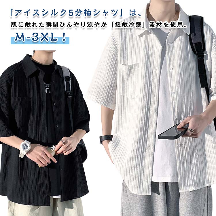 アイスシルクシャツ 半袖 五分袖 夏用 メンズ サマーシャツ 薄手 無地 カジュアルシャツ 開襟シャツ 涼感 ひんやり トップス 軽量 シンプル おしゃれ 着回し 快適 通気性 韓国風 大人カジュアル 白 黒 重ね着 アウター