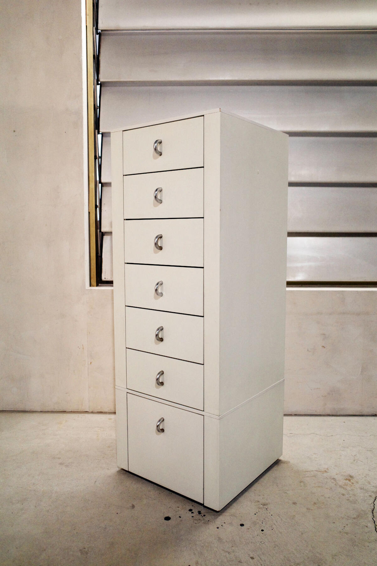 サイドチェスト 6段+1段(キャスター付き)セット Size - W480×D510×H1310 mm (高さ 下段350 mm 上段976 mm) 上段にもキャスターではございませんが脚が4本ついておりますので別々にて使用可能です。 デザイナー - Interluebke/インターリュプケ Manufacture - Interluebke/インターリュプケ カラー - ホワイト系(画像参考) 素材 - ウッド×金属 状態 - ヴィンテージ品 傷、汚れがございます。引き出し中 汚れが多くございます。化粧品を入れていたかと思いますので化粧品のにおいもございます。(画像参考)画像をクリックしていただき設定より画像を拡大できますのでご参考下さい。また現物をご覧になりたい方は倉庫よりお持ちいたしますので事前に来店予定日をご連絡下さい。 配送 - 家財おまかせ便 Cランク 例:関東 7740円 1937年、ドイツのヴィーデンブリックで設立した家具メーカー。合理的で機能性の高いシンプルなデザインを追求したバウハウス思想のコンセプトを打ち出し、世界で最初にシステム収納家具を開発したことで知られています。インターリュプケの製品は、数々の賞を受賞するなど、システム収納の先駆者としてドイツで確固たる地位を確立しています。 今回入荷分は6段と珍しい1段キャスター付きのセットとなり重ねてキャスター付きとして使用もできますしバラバラにて使用する事も可能です。シンプルなデザインで寝室やリビングで合わせられるとても実用性の高い家具かと思います。バウハウスとは、1919年にドイツのワイマールに創設された、芸術を総合的に教育する学校のことです。 ここでは芸術性と機能性、産業を融合させることを目指しており、実用性のある作品が数多く生み出されました。注意 : 当店の商品ページを無断でコピーし掲載し販売価格よりさらに割引した偽サイトがございます。 当店は楽天市場のみの販売となりますので楽天市場以外のサイトで同じ画像が使用されているサイトからは購入しないようお願いいたします。当社とは一切かかわりがございませんのでどうぞよろしくお願いいたします。 バウハウスはナチスの弾圧により14年で閉校。 歴史は短いながらもその功績は非常に大きく機能的で洗練されたデザインという、モダンデザインの基礎を築きました。 閉校後も機能主義の理念はさまざまな形で受け継がれ、現在でも身近にあるデザインの多くに影響を与えています。注意 : ヴィンテージ(中古)の商品になりますので傷、汚れ,匂いや、破損部分等不具合がある商品もございます。 商品の状態の詳しい解説や細かい写真が必要な方は当店にご質問いただければ写真を添付にて送らせていただきます。 ※ヴィンテージ品は傷や汚れ等の状態での理由に関するご返品、返金、交換は受け付けておりませんので気になる点がございましらまず当店へご連絡ください。※現状渡しになります。付属品も画像掲載分のみとなります。
