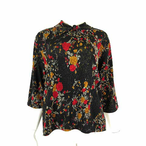 【中古】K.mitsuyo ケイミツヨ カットソー ブラウス シアー シフォン 花柄 総柄 ラインストーン 装飾ボタン ストレッチ 7分袖 M-L 黒 ブラック マルチカラー レディース 【ベクトル 古着】 250526