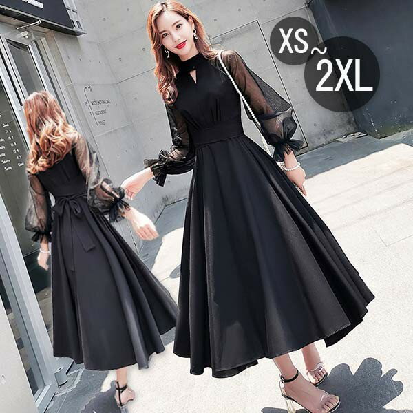 ドレス ミモレ丈 大人 ピアノ 発表会 ドレス 演奏会 ミディアムドレス 袖あり ビショップスリーブ 透け感 ハイアネック パーディードレス Aライン 後ろリボン フォーマル 小さいサイズ ファスナー 可愛い 女子会 結婚式 母親 ドレス ブラック 黒 XS S M L XL 2XL da122x1x1jc