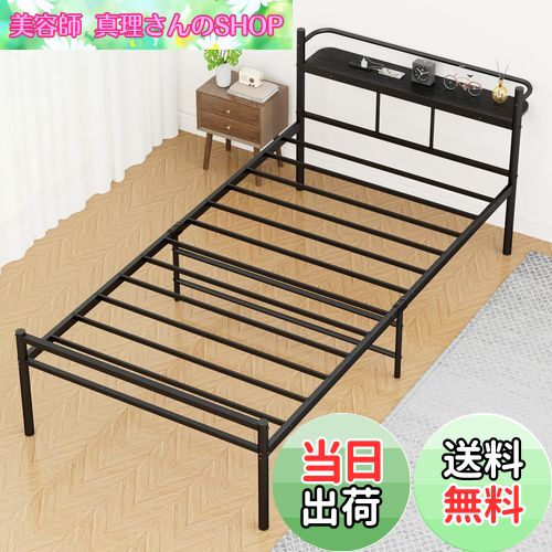 PRTONE パイプベッド ベッドフレーム シングル 棚付き コンセント付き 一人暮らし シングルベッド フレーム 狭い空間向け bed frame single ベッド下大容量収納 頑丈通気耐久 ギシギシしない 耐荷重300Kg ベッドフレーム 黒