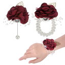 M METERXITY 1セット リストコサージュとブートニアセット 人工ローズフラワーリストとメンズコサージュ 結婚式/パーティー/プロム用 フラワーリストコサージュセット[ワインレッド]