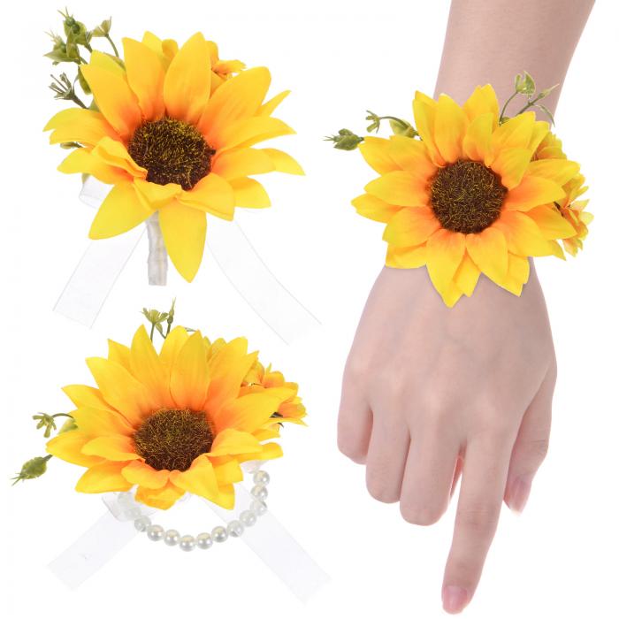 M METERXITY 1セット 人工ひまわりコサージュとブートニアセット 花嫁用リストとメンズコサージュ ウェディング パーティー プロム 装飾用 フラワーリストコサージュブートニアセット [イエロー]