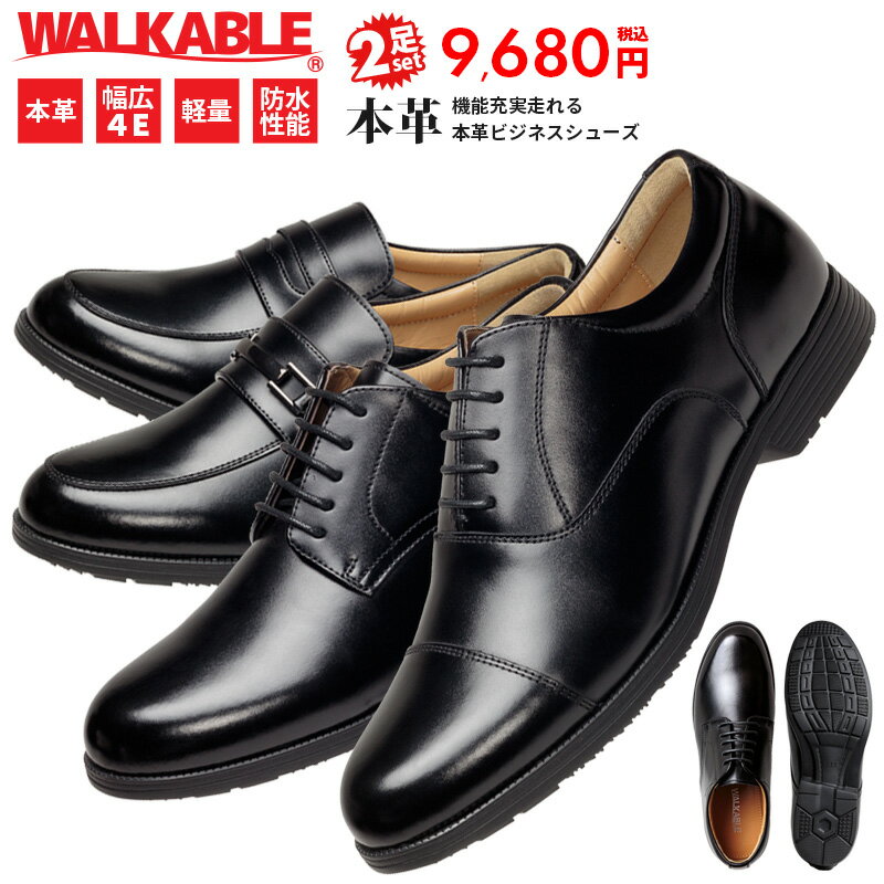 ビジネスシューズ 本革 2足セット 防水 幅広 4E 防滑 多機能 軽量 メンズ プレーン ストレートチップ ビット ローファー ブラック 全4種類 24.5cm 25cm 25.5cm 26cm 26.5cm 27cm WALKABLE 6301 6302 6303 6304