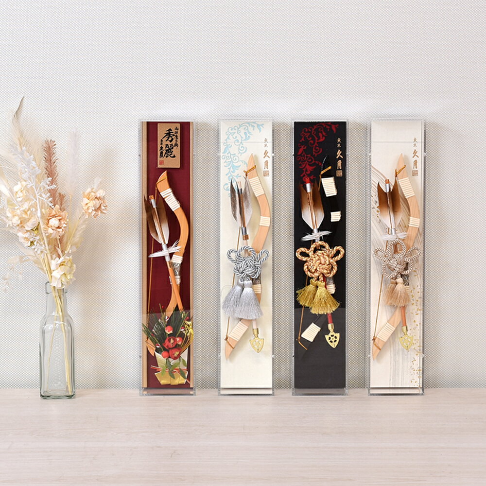 破魔弓 破魔矢 破魔弓飾り コンパクト モダン カッコいい 【 共通サイズ 】横幅21×奥行12×高23cm 和洋室に合う高級自然木使用のケース入り破魔弓 親御様、お子様、縁者様の健康と発展を願いながら職人が丁寧に仕上げた破魔弓飾りが、初正月・初節句のお祝いに華を添えます。 通販・販売 売れ筋ランキング上位の人気の初正月飾りです! --商品補足-- ・撮影環境・ディスプレイ等で画面上と実物では多少色具合が異なって見える場合もございます。 ・金襴生地などの裁断場所の違いで色柄には個体差がございます。 ・製造時期により若干の仕様変更がある場合がございます。ご理解の程お願いいたします。 ・季節商品ですので万一、ご注文が集中した場合など、発送が遅延、在庫切れなどで販売できなくなる可能性が発生いたした場合は、受注メールにてご連絡させていただきます。 雛人形(ひな人形)・五月人形(5月人形)・鯉のぼり(こいのぼり) 羽子板・破魔弓(破魔矢)・販売・通販の人形屋(人形店) --破魔弓って何だろう?いつからあるもの?-- 初正月には、古く中国では、端午の節句に鍾馗(しょうき)と呼ばれる強い武神が現れ弓で悪霊を平らげるという言い伝えがあったといいます。 このような風習が日本の宮中にも伝えられ、弓で的を射る「射礼」「大射」などの儀式が行われていました。 平安の頃から、神社などでは魔除けの意味での破魔弓神事や、年占い神事等が斎行されてまいりました。 「はま」は弓矢でいる的、もしくは射的の競技を意味する語で、のちに「破魔」の字をあて、魔を射る矢と解されるようになりました。 これらの神事が一般の人々の間に広まり、現在のように装飾品として飾られるようになったのは鎌倉時代からだといわれています。 江戸時代に入ると破魔弓は飾り物・贈り物として盛んとなり、初正月飾りの代名詞として、いまも変わらず受け継がれ、男児の初正月には、雄々しく、力強く、健やかに育てとの願いをこめて破魔弓は飾られています。 飾る場所、収納サイズはコンパクトで人気ある破魔弓飾りです。 破魔弓(破魔矢)の通販販売店。初正月の破魔弓購入の選び方に迷われたら弊社にお任せ下さい。 --取扱い品目-- 破魔弓 久月 破魔矢飾り 初正月飾り 破魔弓 壁掛け 破魔弓 初正月飾り 正月用 破魔弓 破魔弓 コンパクト サイズ 破魔矢 ミニサイズ 破魔弓飾り ケース入り破魔弓 破魔弓 四矢飾り 破魔弓 竹ケース 破魔弓 祥秀 破魔弓 ケースなし飾り 破魔矢 色紙 破魔弓 収納飾り 破魔矢飾り 正月飾り 破魔矢 破魔矢立て 初正月破魔矢 破魔弓 黒檀ケース 破魔弓 鉄刀木ケース 破魔弓 花梨ケース 破魔弓 桧ケース 破魔弓 平安豊久 破魔矢小さい サイズ 雛人形(ひな人形)・五月人形(5月人形)・鯉のぼり(こいのぼり) 羽子板・破魔弓(破魔矢)・販売・通販の購入は弊社にお任せ下さい。PC用販売説明文
