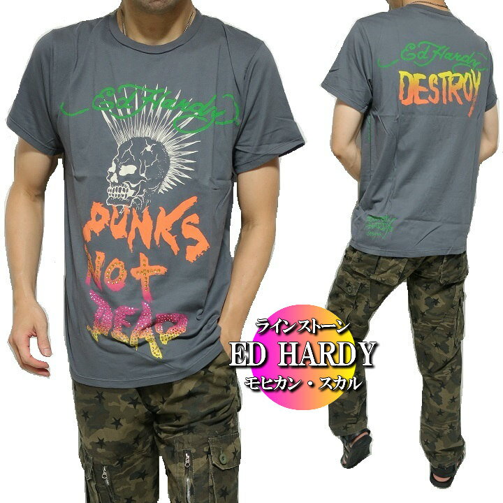 エドハーディー ed hardy エド・ハーディー Tシャツ メンズ モヒカン/スカル ラインストーン/スタッズ 半袖 チャコール M-XL