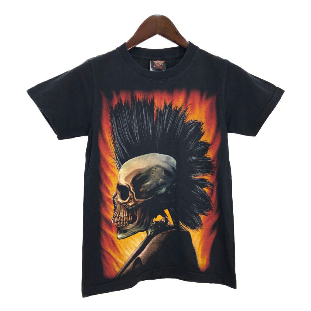 90年代 ROCK EAGLE モヒカン スカル ガイコツ ドクロ 半袖Tシャツ 大判プリント ブラック(メンズ S)中古 古着 T9825