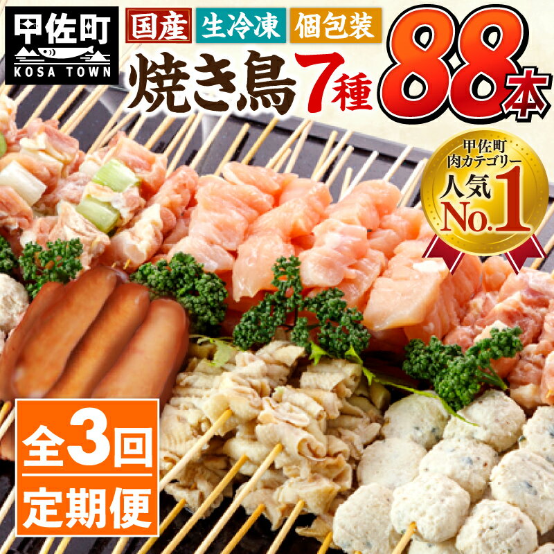 【ふるさと納税】★定期便★国産の焼き鳥★縁起が良い末広がり88本★国産 焼きとりセット <生冷凍>国産 丁寧仕上げの焼き鳥7種セット 88本 ×3ヶ月=264本 - 焼鳥 セット モモ ネギま 皮 ムネ つくね ニラ BBQ バーベキュー 個包装 人気 熊本県 甲佐町【価格改定XA】
