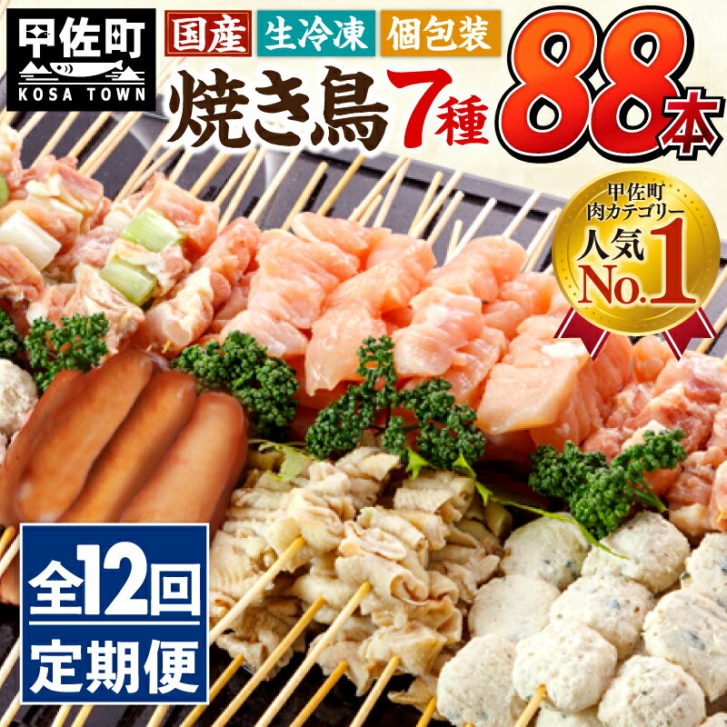 【ふるさと納税】★定期便★国産の焼き鳥★縁起が良い末広がり88本★国産 焼きとりセット <生冷凍>国産 丁寧仕上げの焼き鳥7種セット 88本 ×12ヶ月=1,056本 - 焼鳥 セット モモ ネギま 皮 ムネ つくね ニラ BBQ キャンプ おかず 個包装 熊本県 甲佐町【価格改定XA】