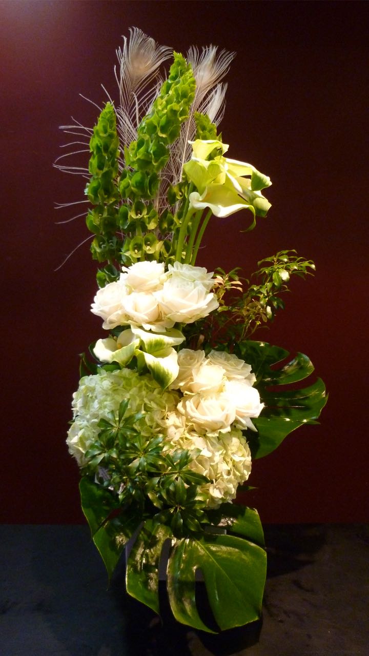 白バラ アジサイ アセビ モルセラカラー 孔雀の羽 モンステラ