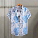 シャツ メンズ 半袖 アロハシャツ ポリエステル スカイブルー 熱帯花柄 モンステラ柄 ボタンダウン ストレッチ ウォッシャブル カジュアル リゾート 旅行 バカンス 普段使い