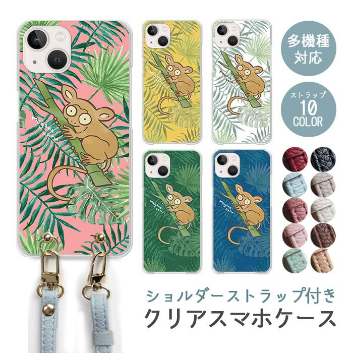 スマホケース ショルダーストラップ スマホストラップ クリアケース ハードケース 透明 メガネザル 眼鏡猿 モンステラ パームリーフ 南国 iphone17 iphone16e iphone16 iphone15 iphone14 GooglePixel 9a AQUOS wish4 arrows We2 かわいい レディース おしゃれ