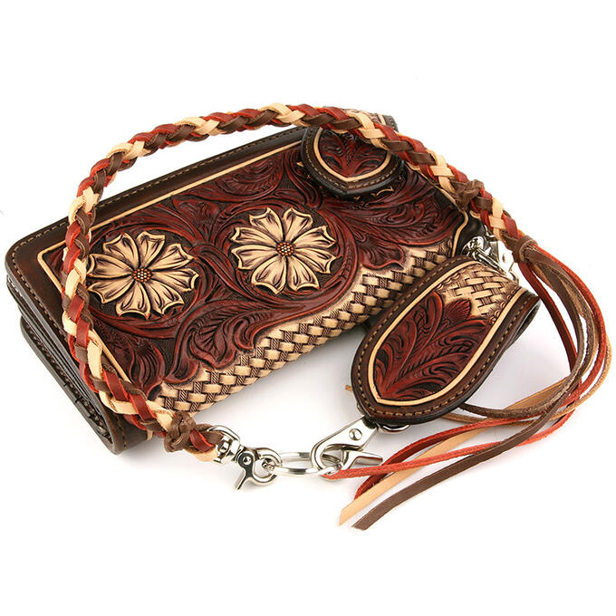 【KC,s LEATHER CRAFT (ケイシイズ レザークラフト)】 KC,sの商品は全て日本製です。選び抜かれた最高級の本革を使用し、25年以上の経験を持つ職人の技を駆使した逸品となっております。ご自分へのプレゼントとしてだけではなく、贈り物(還暦・古希・喜寿・傘寿・米寿・卒寿・白寿・百寿・茶寿などの長寿のお祝い・結婚式・成人式・入学式・退職祝い・入学祝い・母の日・父の日・敬老の日のプレゼント・昇進・昇格・退官・栄転・受賞・新築・表彰・記念品・ご贈答)に最適です。 【修理・保証書について】 ケイシイズ革製品(時計含め)の修理や交換や不良品対応につきましては、当店では出来ず、メーカー対応となりますため、メーカーの方へ直接ご連絡いただく形となります。メーカーの情報につきましては、ご連絡いただきましたらお伝えいたします。 商品によっては、保証書(ギャランティカード)が付属されておりますが、販売店名等の欄は未記入となっております。販売店の証明は、お買い上げ明細書となりますので、明細書が必要な方はご連絡くださいませ(発送前にご連絡頂いた場合は、帳票にて発行し、商品に同梱いたします。発送後にご連絡頂いた場合は、PDF又は、JPGにて発送しメール送信いたします)。 【商品名】 モンタナ ウォレット 【材料】 素材:EU.ダブルバット(牛皮革) ステッチ:ミシン ステッチ 【色】 ●タン2トーン ●ブラウン3トーン ●ブラック3トーン 【サイズ】 クローズ/タテ=19cm ヨコ=10cm オープン/タテ=19cm ヨコ=20cm チェーン/48cm【商品紹介】 数千点に及ぶKC,sのアイテムの中で、頂点に君臨するフラッグシップモデル「モンタナ シリーズ」のクラフト モデルです。究極の財布を目的に素材、細工など全てにおいてこだわりぬき、ケイシイズの全ての工程の最高品質と技術のみを追求して製作致しました。生産数は極めて少量です。図柄は下絵等、一切存在せず、革を湿らせ、フローラル柄の彫刻を施します。これをケイシイズではクラフトと呼び、カッティングとスタンピングの2つの技法が組み合わされます。スイヴェル ナイフとカスタムを施した18種類以上のスタンプ ツールから成り立っており、ケイシイズの作品は30年以上のキャリアを持つ熟練のクラフトマンが製作に携わっており、多種多様な工程を経て始めて完成します。クラフト柄の中でも代表的なフローラル パターンですがクラフトマンにより柄の雰囲気も違えば、同じクラフトマンでも一つとしてない全てがハンド メイドの逸品です。インナーパーツ(内側)は2つのパートに別れており、開けた状態の右側に中心にむかってカードケースが6つ、その下に小銭入れ、さらにその下に紙幣等が入るポケット、左側中心にむかてカードケースが6つ、中心の右側にめくると右側にチケットホルダーが1つ、左側中心にむかってカードケースが6つ、合計18のカードケースがあります。ヒップポケットに収めベルト等にキーリングを装着しウォレットチェーンでつなげて使用します。ウォレットとウォレットレーンの接続にはオリジナル金具「ケイシイズポスト」を使用しております。素材のEU.ダブルバット(牛皮革)とは、ヨーロッパ産の牛原皮のみを使用し、フランスとの国境に近いベルギー唯一のタンナー(皮革製造業)でるタナリーマズール社で、ケブラコ、ミモザ、栗の木からのタンニンを使う伝統製法で鞣した牛皮革です。きめの細かく、手染めやカービングに適した高級皮革です。染色はクラフトマン独自の特殊染毛で手で塗り分けております。カラーは3色からお選びいただけます。