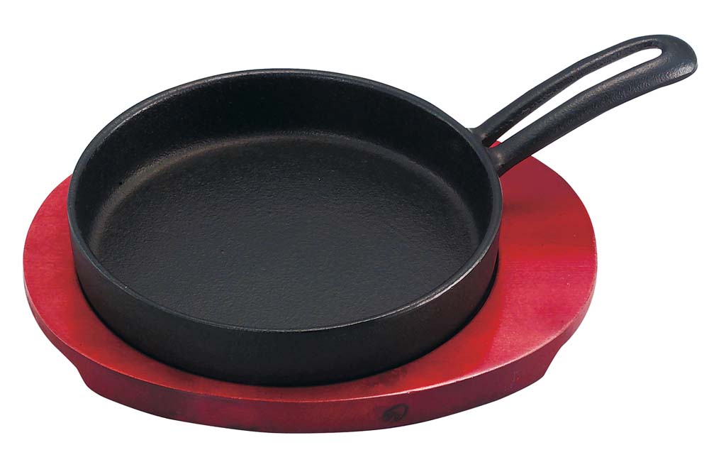 ステーキ皿 プレート 焼物 グリルパン 鉄鋳物 IH対応 中国産 モーニングパン ステーキ皿 木台 直径15×高さ4.5cm 重量約1.0kg 1台単位 伝統工芸 鉄分補給 積み重ね収納 美味しい ステーキ 焼料理 ハンバーグ【送料無料・代金引換不可】