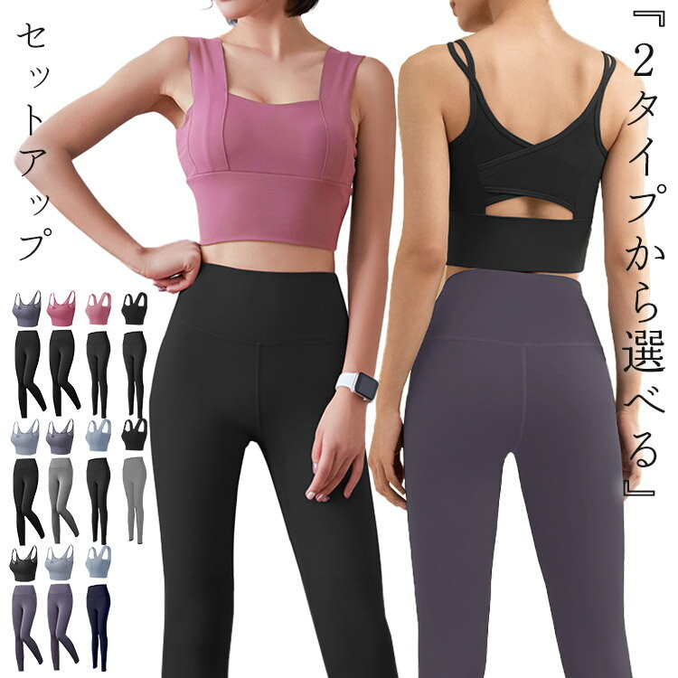 ヨガウェア 上下セット ブラトップ レギンス レディース 2点セット セットアップ ヨガトップス スポーツウェア ピラティスウェア カップ付き 2type ダブルストラップ カットアウト 肩ひも 太め 幅広ストラップ ビスチェ風 ハイウエスト ダンス 伸縮性 吸汗 速乾 黒
