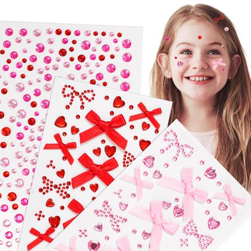 3枚セットラインストーンシールピンク赤リボンステッカー3Dキラキラ顔シールフェイスステッカーカラフルアイメイクネイルパーツ舞台化粧接着剤不要貼り付け可能携帯装飾DIYピンセット…