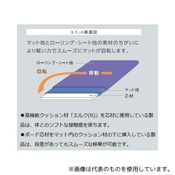 商品の仕様 ●サイズ/幅50×長さ140cm ●重さ/2.25kg ●材質/ローリング・シート地・マット地・収納袋:ポリエステル100%、芯材上部(エルク):複合繊維(ポリエステル)100%、芯材下部(ボード):ポリプロピレン100% 商品の説明 ・移乗がらくらく。凹凸、段差をスムーズに移乗。 ・移乗する先の形状にフィットする構造で、芯材がU字型に曲がるので、臀部や膝にフィットします。 ・移乗先の形状とボードの形状が合わさることで、身体に受ける衝撃などを軽減します。 ・介護用ベッドと車いすの間にできる隙間をなくし頭から膝裏までをサポートするので、安全・快適に移乗できます。 ・ローリングシート部分の表面は撥水加工、マット地部分の表面は防水加工を施しています。 ※マットレスとベッドの側板の隙間程度であれば、乗り越え可能です。本品を橋渡し状態にして体重を支えることはできませんのでご注意ください。