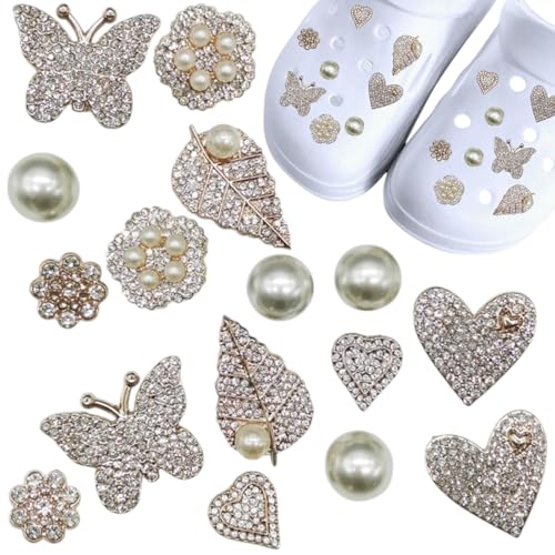 リーフ バタフライ チェーン クロックス 用 シューチャーム 16個セット PVC製 ラインストーン 靴 アクセサリー ジビッツ 可愛い サンダル ボタン 蝶 ラグジュアリー パール
