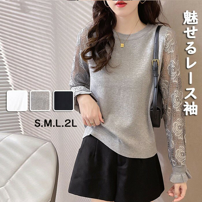 レース袖 切替 トップス レディース 秋 長袖 クルーネック カットソー トップス ゆったり 大きいサイズ デザイン きれいめ おしゃれ カジュアル 可愛い 無地 体形カバー 通勤 送料無料