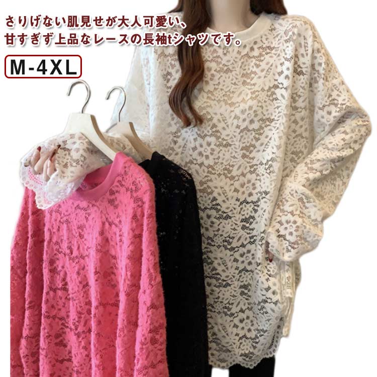Tシャツ レディース 花刺繍レースTシャツ ブラウス ロング 薄手 長袖 ティーシャツ チュニック プルオーバー 大きいサイズ ゆる ドルマン 無地 お尻が隠れる ミセス 大人ファッション ブラック ホワイト ピンク