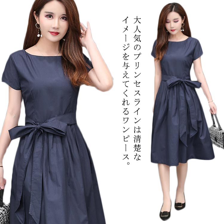 ワンピース ミティアムワンピース Aラインワンピース レディース 膝丈ワンピース 半袖 ふんわり 無地 ドレス ラウンドネック リボン付き フレアワンピース 着痩せ 就職 入学式 結婚式 お葬式 卒業式 通勤 OL オフィス シンプル お洒落 スッキリ 夏新作 送料無料