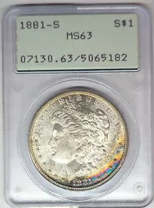 1881 S MS63 モーガン ネオン レインボー三日月 PCG ラトラー ピンクとダークブルー