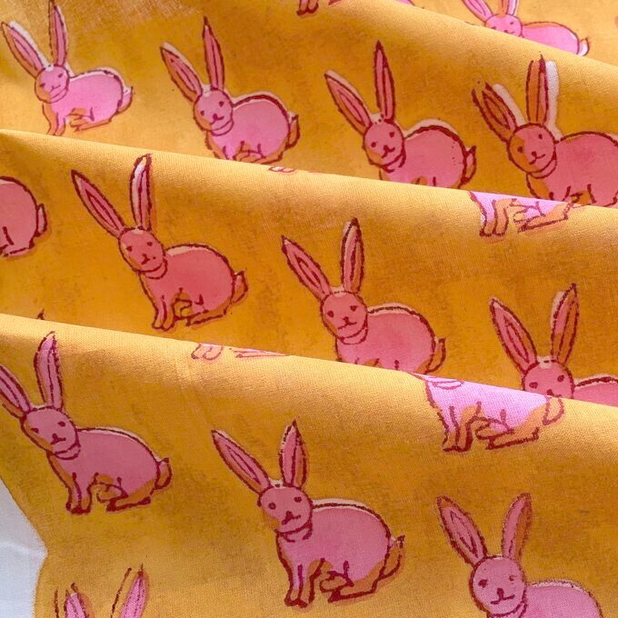 インドブロックプリント 生地 [ 50 cm単位 切り売り ] サンガネリ ラビットピンク オレンジ 地 うさぎ 兎 ファブリック 布 布帛 カットクロス 薄手 綿 薄地 コットン 100%