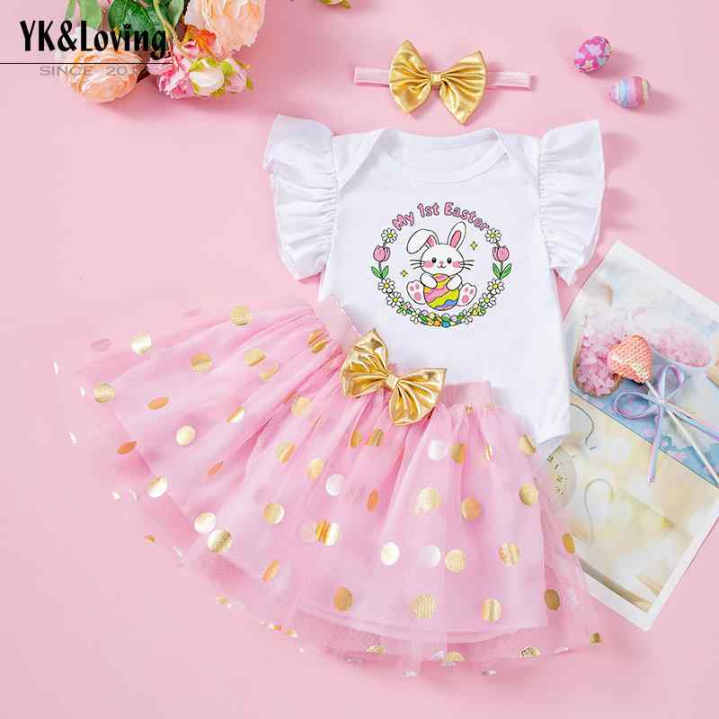 ベビー服 3点セット 春夏 イースター バニー ラビットプリント 半袖ロンパース チュールスカート ヘアバンド付き かわいい 赤ちゃん 女の子