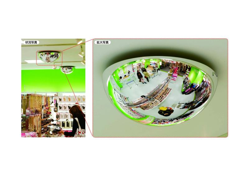 ドーム型で360°どこからでも安定した映像が見られる機能的な防犯ミラー。さまざまな空間に調和するやわらかな雰囲気が特長のドーム型防犯ミラーです。取付金具は簡単に設置可能。 ミラーも着脱簡単、取付金具に掛けるだけ!防犯ミラーを設置すると、万引減少に効果的なだけでなく、お客様への気配りにも役立ちます。死角がなくなり、今まで見えにくかった店内の様子まで見わたすことができるので、お客様に対し素早い対応が可能!防犯ミラーを設置し、常に店内の監視に力を入れていることを示すことによって、万引を未然に防止する効果もあります。