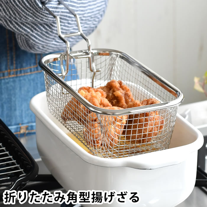 商品名 角型揚げざる 商品詳細 サイズ 外寸:約 W34×D11.3×H11.5cm ざるの内寸:約 W18×D9.8×H6.7cm 重量 約127g 素材 ステンレス鋼 仕様 持ち手は折りたたみ可 原産国 中国 備考 ※揚げざるのみの販売です。 ※本製品本来の使用目的以外には使用しないでください。 ※調理中や直後は非常に熱くなっています。必ずミトン等を用いてヤケドに注意してください。 ※手や腕、衣服等で揚げざるの取っ手を引っかけないように注意してください。 ※電子レンジでは使用しないでください。電子レンジの故障や火災の原因になることがあります。 ※食器洗浄機や食器乾燥機をご使用の際は機種の取扱説明書にそって正しく使用してください。 検索キーワード 角型 揚げざる 四角い 天ぷら鍋 揚げ物ざる 角型 フライバスケット 油切り ザル 揚げかご ih対応 スクエア フライヤー 片手 取っ手付き コンパクト フライドポテト 一気揚げ 角型天ぷら鍋 シンデレラフィット ステンレス 野菜 湯切り ラッピング ラッピングOK →詳細はこちら角型揚げざる 角型天ぷら鍋にシンデレラフィット!一度に油切りできる角型揚げざる まるでお店のように揚げ物を一気に引き上げられて油切りできるバスケット型の“揚げざる” 人気の角型天ぷら鍋にピッタリなサイズ! ポテトはもちろん、素早く取り出したい唐揚げの2度揚げや、崩れやすいコロッケなどに使えば 時短にもなって料理のクオリティアップにも◎ ※揚げざるのみの販売です。 関連商品 角型天ぷら鍋(ホワイト) ポコフリット IH対応 角型揚げ鍋(アミ付き) カス揚げ →シリーズ一覧を見る