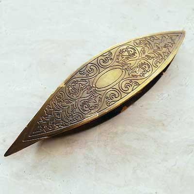 ヴィクトリア朝時代の復刻デザイン。 金属製、古びた味わいのあるアンティーク調のタティングシャトルです。 角(ポイント)があるタイプです。 サイズ:長さ9.2cm 幅2.4cm 厚み0.9cm