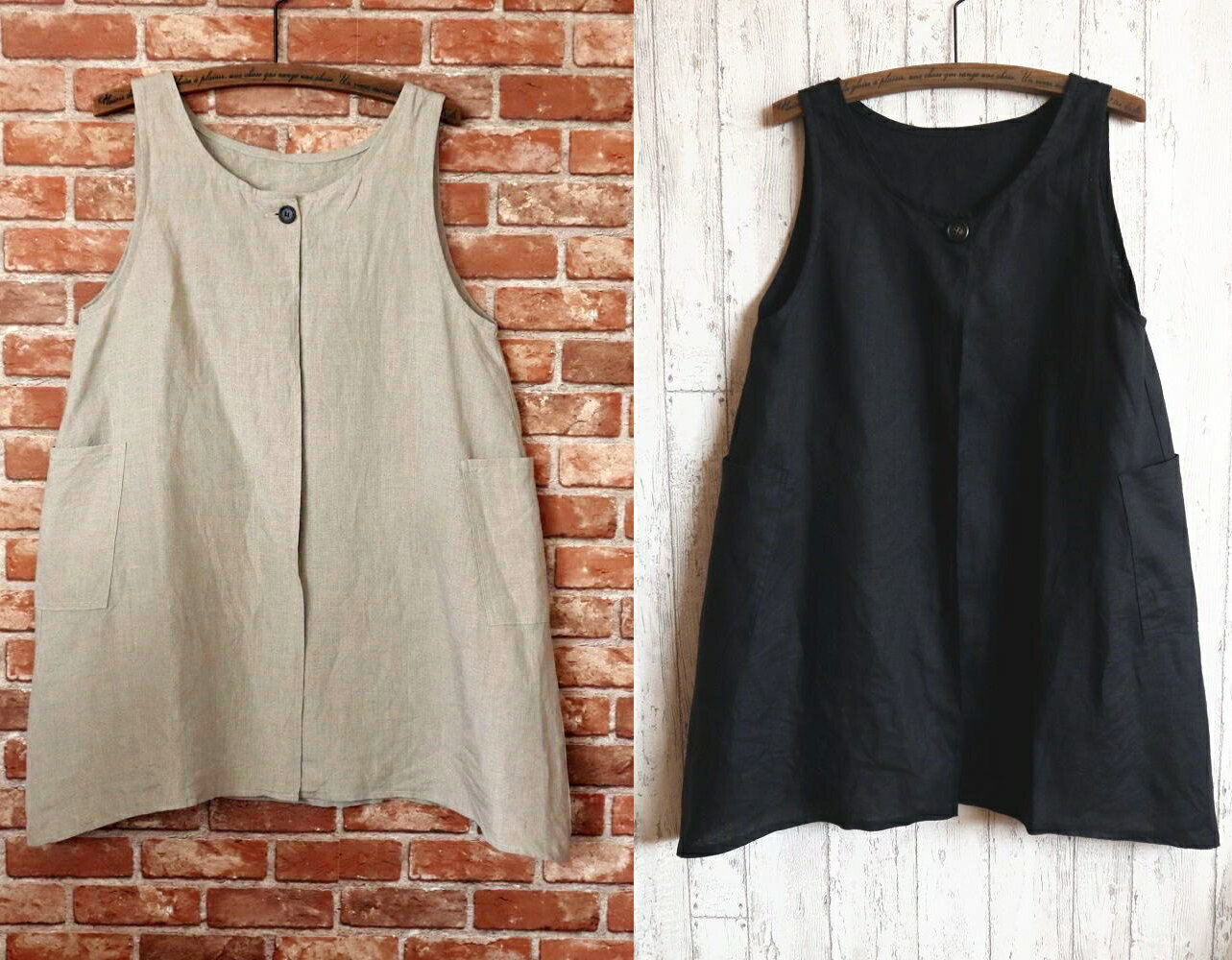 リネンジレ ベスト リネンベスト リネンベスト ジレ Vネック レディース 無地 ポケット付き ノースリーブ