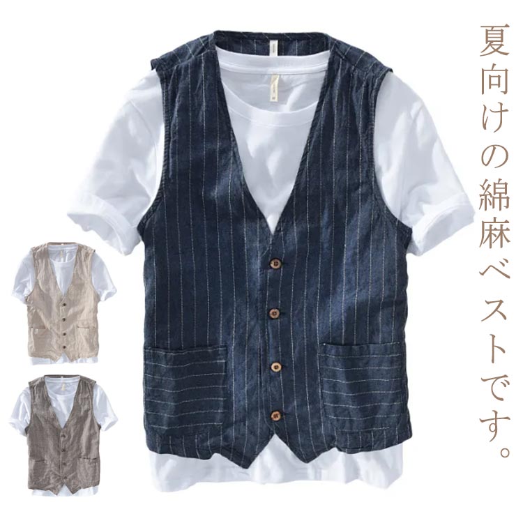 ベスト メンズ 麻 コットン 前開き おしゃれ トップス 夏 リネン 通気性 リネンベスト Vネック ストライプ 薄手 リネンジレ ショート丈 カジュアル ナチュラル ビジネス 春夏 夏服