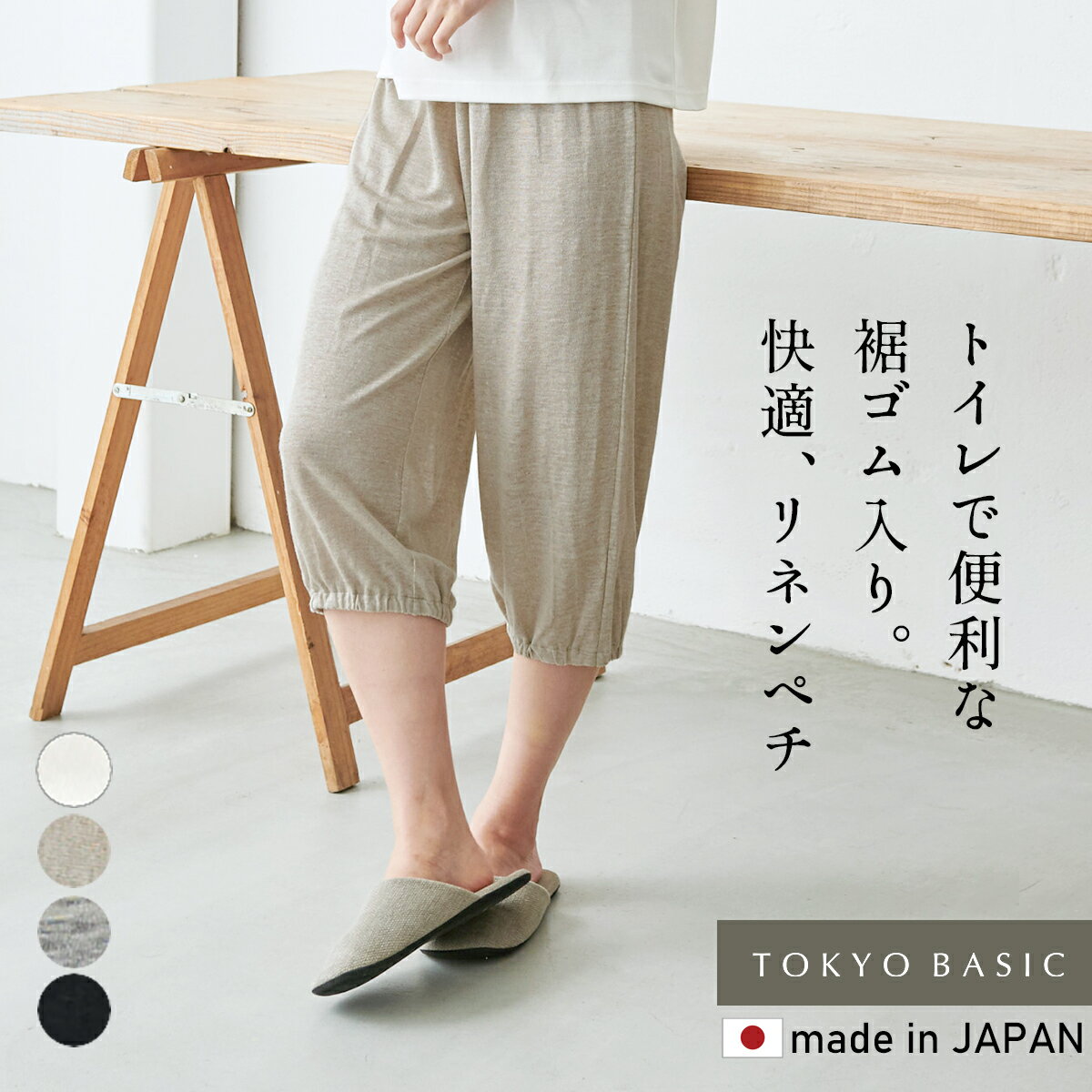 ペチパンツ ロング 涼しい 大きいサイズ リネン 裾ゴム ペチコート 天然素材 吸湿 速乾 麻100 春 夏 インナー トイレで便利な裾ゴム入り インナー ベージュ 生成り ブラック 黒 グレー ホワイト M L LL 大きいサイズTOKYO BASIC リネン100% プレミアムリネン®100% 裾ゴム入りロングぺチパンツ SIZEM・L・LL COLOR生成・ブラック・杢グレー・オフホワイト カラー 生成・ブラック・杢グレー・オフホワイト サイズ サイズ ウエストゴム上がり ヒップ 前股上 股下 渡り幅 裾幅 M 約64cm 約102cm 約27cm 約43cm 約32cm 約20cm L 約67cm 約106cm 約27cm 約45cm 約33cm 約21cm LL 約70cm 約110cm 約27cm 約47cm 約34cm 約22cm サイズ計測方法はコチラ>>> 原産国 日本製 素材 麻100% 洗濯表記 手洗い ※プレミアムリネン®商品を長くお使いただく為にもお洗濯は「手洗い」を推奨いたします。 もし洗濯機を使用される場合は、必ずネットに入れて洗濯してください。 裏地 なし ポケット なし モデル着用サイズ Mサイズ メール便 ○ 特徴 さらりと快適な履き心地で大変ご好評いただいている「プレミアムリネン® ペチパンツ」ですが、お客様から「もう少し長い丈のものも欲しい」とのご要望からロング丈を作りました。さらに、裾にゴムを入れて、トイレのあの問題を解決!ワイドパンツやガウチョパンツって脱ぐとトイレの床に裾が付いてしまいますよね…裾を巻き上げればゴムで止まって床につかない機能も加えました。また、インナーとしてだけでなく、夏のお部屋着としても使える便利なアイテムです。 ※画面上の商品の色は、お使いのパソコンモニターの設定や照明により、実物と異なる場合があります。 この商品はゆうパケット対応可能です。 ゆうパケットは全国一律¥200です。 ・ 購入時の配送方法選択は「メール便」をお選びください。 ・ 代金引換・配達日時をご指定頂くことはできません。 ・ 紛失・不達時の保証、破損の際の補償が一切ございません。 ・ 表札には名前が必須となります。 ※ ゆうパケットは配達員による手渡しでなく、郵便受け等への投函でのお届けとなります。