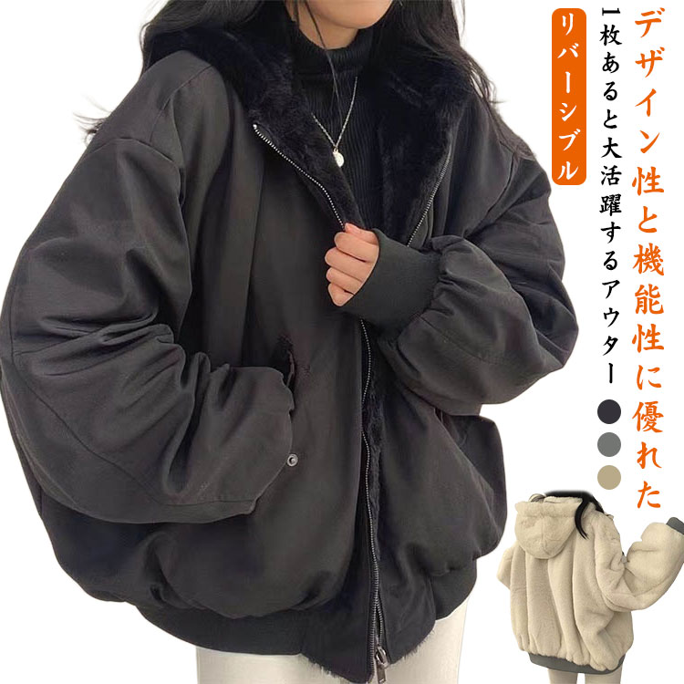 裏ボア レディース 裏起毛 ボア ボアジャケット もこもこ リバーシブル 中綿ジャケット 厚手 両面着 秋 中綿ジャケット ジャケット アウター ふわふわ ブルゾン オーバーサイズ あったか 防寒 保温 中綿 ゆったり 袖口リブ カジュアル 学生 女子 通学 通勤