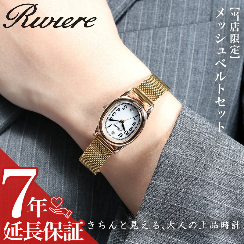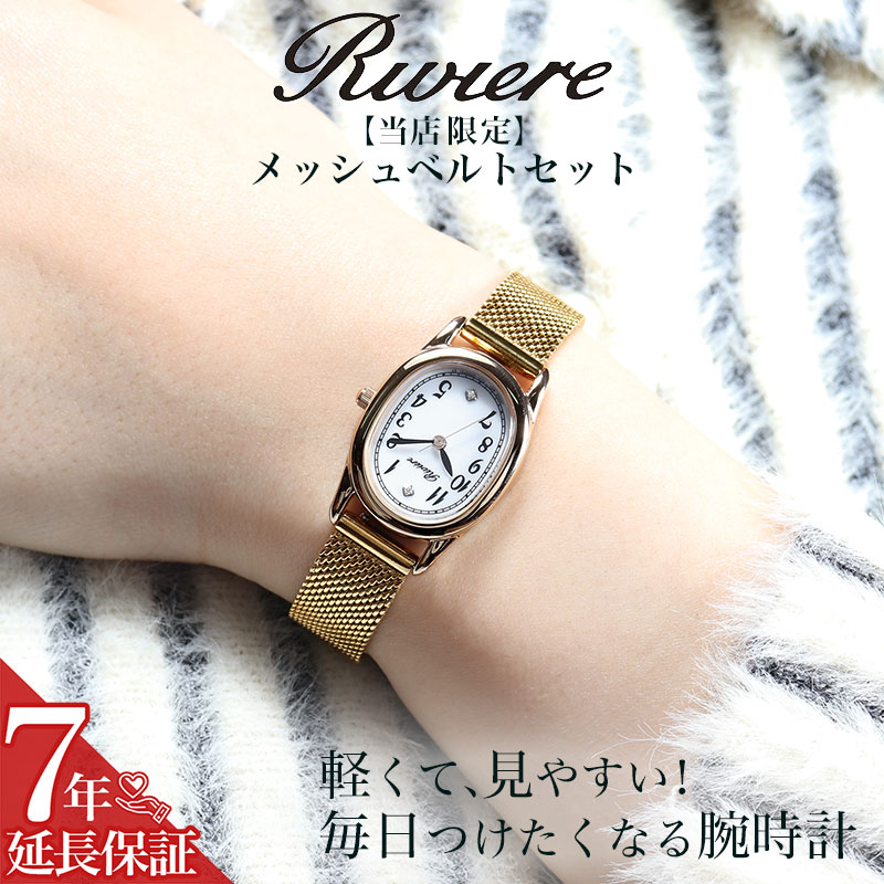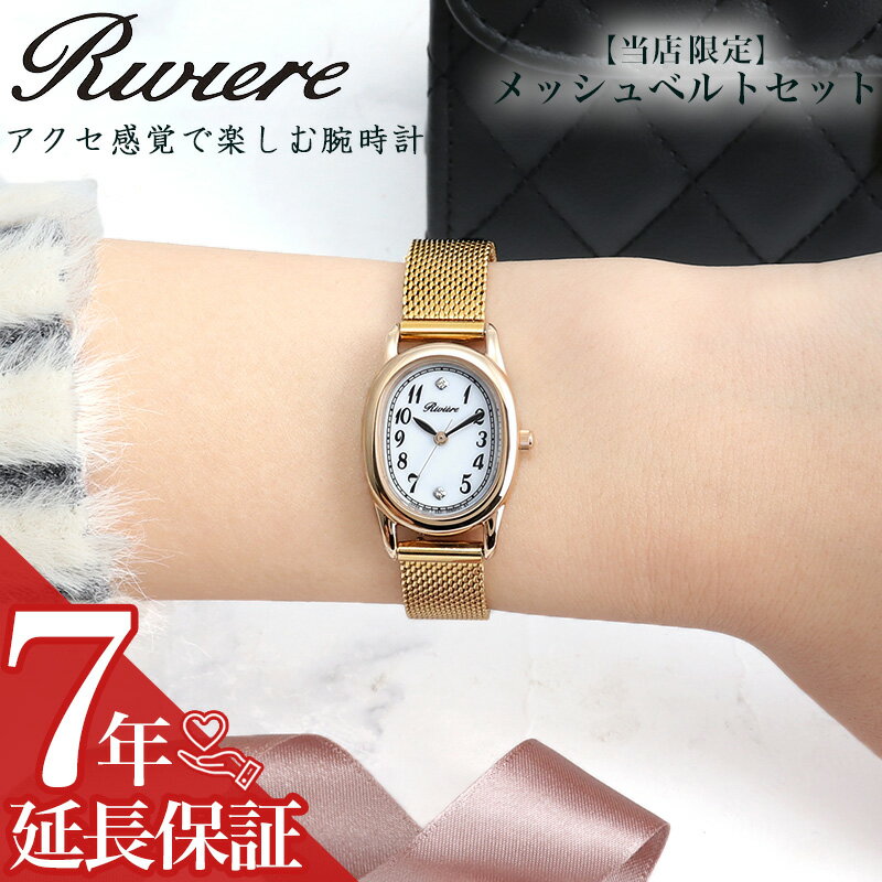 メーカー希望小売価格はメーカーサイトに基づいて掲載していますこの商品のお問い合わせ番号CPR-item-26012901■ 商品詳細説明 シチズンリビエール[CitizenRiviere]見やすい文字盤に高級感漂う牛革ベルト。機能性も備えたソーラー腕時計。多彩なシーンで着用できます。[ 商品ポイント ]電池交換不要のソーラーテック光を電力に変えるシチズン独自のソーラーテックを搭載。電池交換の手間がなく、毎日安心して使えます。当店限定メッシュベルトセット当店でしか手に入らない、特別なメッシュベルトをセットに。時計の表情を変えて、コーディネートの幅を広げます。選べる2カラーで、毎日使いやすくブラックは引き締まった大人の雰囲気に、ゴールドは華やかで上品な印象に。通気性の良いメッシュベルトで蒸れにくく、気分やシーンに合わせて快適に使えます。工具不要、簡単付け替えイージーレバーピン仕様なので、工具を使わず指先だけでベルトの着け外しが可能。気分や装いに合わせて、手軽に付け替えを楽しめます。見やすさにもこだわった文字盤数字インデックスを採用し、時間がひと目で分かる設計。デザイン性と実用性を両立しています。手元を美しく見せる、華奢なサイズ小さめのケースと細ベルトが、手首をすっきりと演出。主張しすぎず、女性らしい上品さを引き立てます。クリスタルが添える、さりげない輝き12時と6時位置にあしらわれたクリスタルが、控えめながらも上質なきらめきをプラス。大人の女性にちょうどいい華やかさです。マットなクロコ型押しベルト純正ベルトは落ち着いた質感のクロコ型押しレザーが、腕元に高級感を演出。オン・オフどちらの装いにも合わせやすい仕上がりです。仕事もお出かけも、これ一本きちんと感のあるデザインなので、オフィススタイルにはもちろん、休日のきれいめカジュアルにも自然になじみます。シーンを選ばず使える、頼れる一本です。型番【No.01】 KP5-921-10 【No.02】KP5-921-70シリーズRiviere リビエールケース材質ステンレススティールケース径縦:33.5mm×横:22.2mmケース厚さ6.8mmベルト材質[純正] 牛革 [付属] メッシュベルトカン幅12mm腕回り[レザーベルト] 約13.8〜18cm [メッシュベルト]約12.5〜19cm重さ[レザーベルト] 約17g [メッシュベルト]約26gケースカラーローズゴールドベルトカラー【No.01】 レッド 【No.02】 ネイビー 【メッシュベルト】 ゴールド / ブラック 機能平均月差±15秒 フル充電より約6ヵ月可動 ムーブメントソーラー風防素材クリスタルガラス防水性日常生活用防水付属品ブランド純正BOX保証書※SDGs(環境問題)への取り組みの一環として、紙の説明書が付属しないブランドがございます。予めご了承くださいませ。