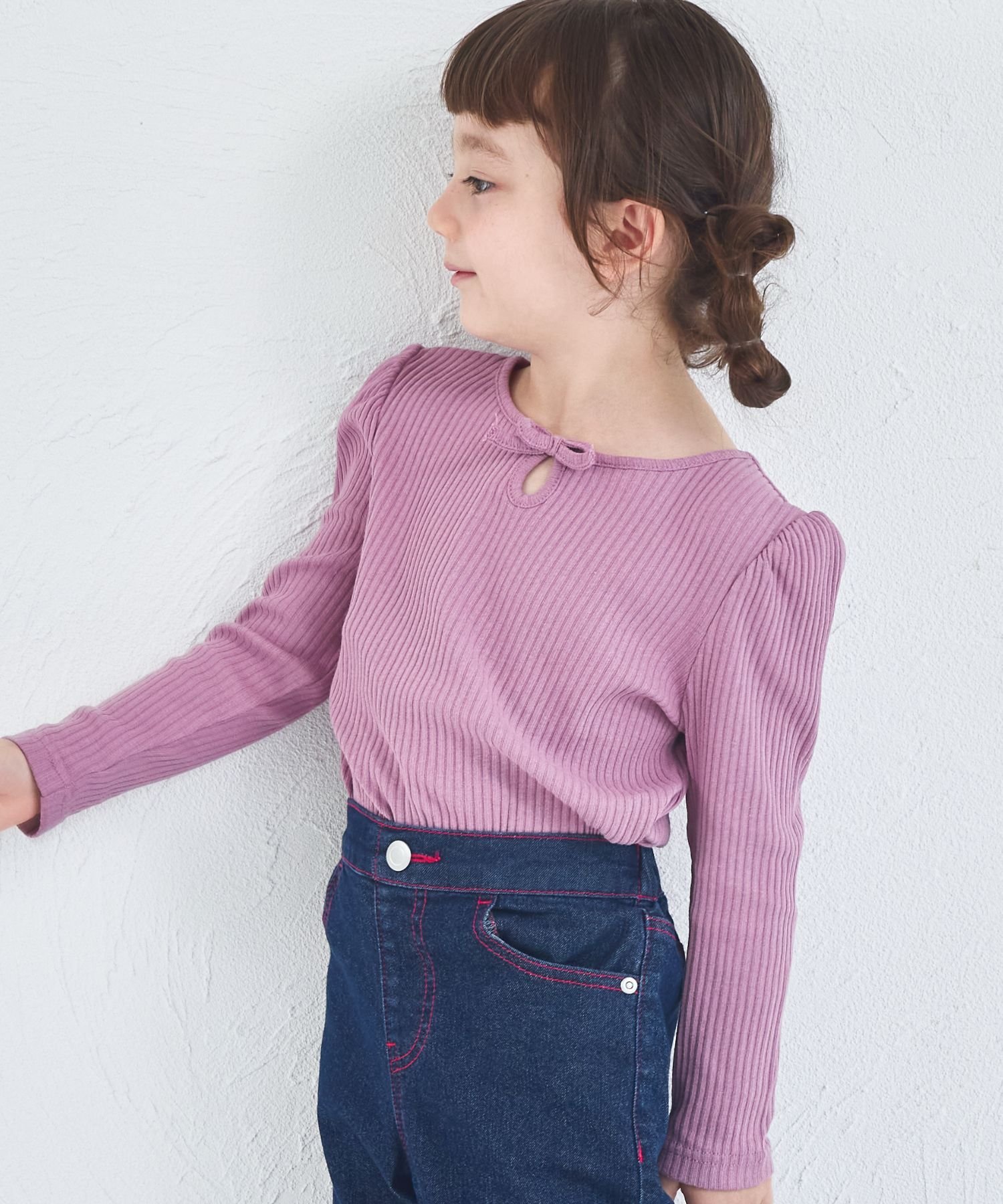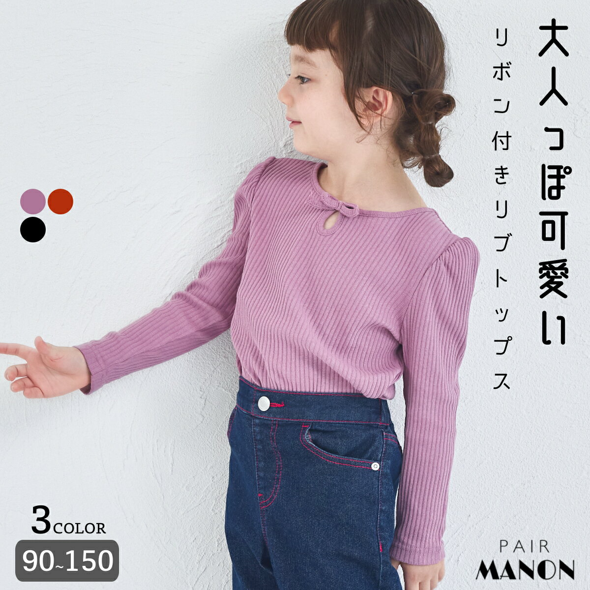 【リブコットン100】パイピングリボン リブトップス 子供 キッズ ガールズ ジュニア 女の子 90cm 100cm 110cm 120cm 130cm 140cm 150cm 秋 冬 pairmanon プチプラ 通園 通学 お出かけ 上品 シンプル お揃い ガーリー フェミニン ペアマノン