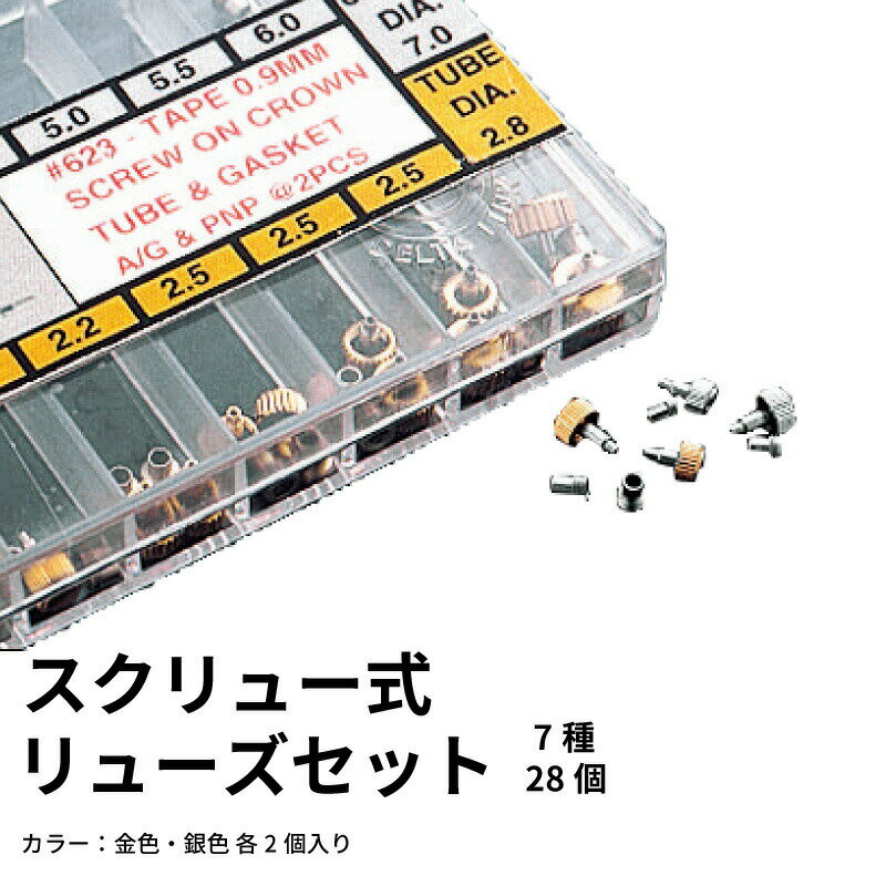 商品情報 商品名 スクリュー式 リューズセット (7種28個) 商品説明 カラー:金色・白色各2個入り 注意事項 ご使用の際には十分ご注意下さい。 ※時計のパーツは大変小さなものが使用されております。紛失や誤飲食にもご注意願います。 ※お客様ご自身のメンテナンス作業に伴うキズや故障に関しては、当店では一切保証できませんのでご了承願います。 お子様等が絶対に触らないよう注意してください。