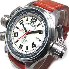Aeromatic 1912 (エアロマティック1912) ドイツ 『Aeromatic(エアロマティック)』は、ドイツのフランクフルトにある新進腕時計メーカー。殆どの東ドイツ腕時計メーカーは第二次世界大戦後、旧ソビエトに工場自体が接収され、独自の進歩、開発が閉ざされた。そして統一後に失われた歴史を取り戻すかのように数々の時計メーカーが誕生し、多くのモデルを発表。中でもAeromatic(エアロマティック)は、ミリタリー、ダイバーズ、パイロットを中心に、ドイツらしさに溢れたデザイン、機能性を感じさせる腕時計として注目を集めるようになった。現在では、 Aeromatic(エアロマティック)社はヨーロッパで開催されている様々なダイビング大会に公式スポンサーとして参加し、ダイバーウォッチとしての評価も得ている。 Aeromatic 1912 (エアロマティック1912) A1284 ドイツ ミリタリー パイロットウォッチ 腕時計 【Aeromatic 1912 (エアロマティック1912) A1284 GMT 3リューズ ドイツ ミリタリー パイロットウォッチ 腕時計】 ドイツのミリタリーウォッチブランド『Aeromatic 1912 (エアロマティック1912)』から、世界主要24都市のGMT(第二時間帯)ワールドタイムを表示可能なパイロットウォッチ【A1284 ワールドツアー GMT 3リューズ】が登場!!クォーツムーブメントを採用。都市名と時間帯のインナーベゼル操作で、知りたい都市の時間帯を表示可能!リューズは大型でねじ込み式のリューズプロテクションを搭載。ドイツのミリタリーテイストをブランドイメージに掲げるAeromatic 1912 (エアロマティック1912)のコダワリを感じます☆機能面も充実のユニークなデザインのパイロットウォッチ!なかなか手に入らないドイツウォッチを今この手に★ ブランド名 Aeromatic 1912 (エアロマティック1912) ムーブメント クォーツ ケース ・ステンレス ・約直径47×厚15mm ベルト ・レザー ・内周:約18-25cm ・幅:約22mm 重さ -g 機能 ・GMTインナーベゼル ・世界主要24都市表示 ・ねじ込み式リューズプロテクション ・GMT時間帯表示(12時位置) ・デイトカレンダー表示(6時位置) ・蓄光(文字盤) 防水性 20気圧防水(200m) ※潜水機能はございません 付属品 純正BOX 保証 メーカー1年保証 備考 正規輸入品 修理について Aeromatic 1912 (エアロマティック1912)につきましては、全てメーカー(ドイツ)での修理対応となります。修理依頼が月一度まとめての発送となるため、修理完了までに約2ヶ月程度はお時間を頂きます。 また、修理に関する保証内容はメーカーが定める保証内容に準じます。メーカーの修理依頼受付数、パーツ在庫状況、国際便での輸送時の大幅な遅れにより遅延する場合もございます。予めご了承下さいませ。 在庫について 当店では、複数のショッピングサイト、オークションにて販売をしており、折り悪く当店在庫が完売している場合がございます。お急ぎのお客様は、お問合せにて在庫状況をご確認下さいませ。当店在庫が欠品している場合、メーカー本国(ドイツ)からのお取り寄せとなります。入荷までの納期としましては、2週間〜1ヶ月程度お時間を頂きます。万一、メーカー在庫が完売している場合、大変恐縮ではございますが、ご要望に添えない場合がございますので 、予めご了承頂いた上、ご検討下さいますよう、お願い致します。