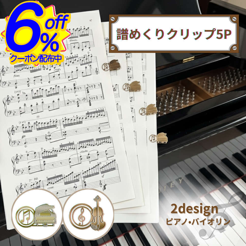 ←300円以下の商品←301~500円の商品←501~700円の商品 ▲20日から使える6%OFFクーポンを取得する▲20日から有効な3個買ったら使えるクーポンなど4種類も取得する 広げられない長い曲の楽譜や連弾の楽譜など、譜面台に楽譜を広げるのが難しい時に譜面めくりをサポートしてくれるマーカークリップです。 ピアノやバイオリンでデザインされたクリップを楽譜の右サイドに挟めば、クリップに指がかかり、演奏中めくりずらい楽譜もスッとスムーズにめくることができます。 コンパクトなサイズ感なので楽譜にクリップを挟んだままでの持ち運びができ、5個セットなので5ページに渡り挟めます。 練習中の曲の楽譜上部に挟んで、ブックマークとして使っても◎ 高級感があるハニーゴールドカラーなので、ピアノ発表会の記念品や、音楽好きな方へのプチギフトとして喜ばれます。 サイズ:ピアノ1.7x3.3cm バイオリン2.7x2.2cm 厚み:0.3mm 素材:金属 こちらのアイテムもいかがですか?ギフトに音符クリップセット。マグネット付きだから譜面も貼っておける【2個セット】猫と音符デザインの楽譜クリップ。開きにくい楽譜もしっかりおさえて弾きやすいピアノ発表会記念品におすすめの文具セット。音符柄のクリアファイルとノートセット