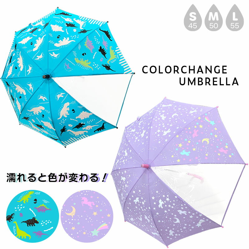 傘 キッズ 子供用 50cm 55cm 濡れると 色が変わる 子ども 男の子 女の子 カサ 手開き グラスファイバー 透明窓 女児 男児 長傘 雨傘 小学生 恐竜 ユニコーン マリン マーメイド シャチ レイングッズ 丈夫 安全 オレンジボンボン ザジーザップス