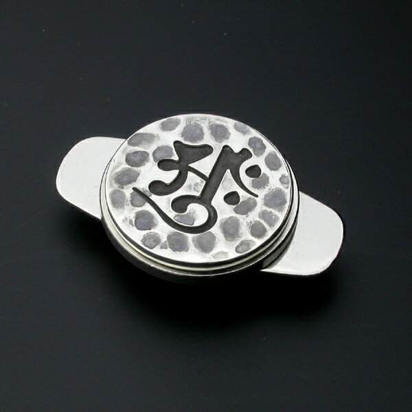 槌目模様を施したシルバーのプレートに守護梵字を彫刻したゴルフマーカーとハットクリップのセットです。※クリップの仕様が変更となります。ご注意ください。 ゴルフマーカーとハットクリップがセットになっておりますので、届いたあとはすぐにお使いいただけます。 また梵字だけではなくお好きな文字を彫刻することも可能ですので、コンペの景品などにもオススメです。詳しくはお問い合わせくださいませ。 ※マーカーの裏面にステンレス製の板を接着しており、クリップ側の磁石にくっつきます。 【マーカーサイズ】直径24mm、厚み1.5mm 【重量】約7g ■ご注意点 ※使用する際に指などはさまないようご注意ください。 ※磁気の影響を受ける精密機器や電気製品等はマグネットに近づけないでください。 ※ペースメーカー、電子医療機器等装着の方の近くで使用しないでください。 ※ こちらの商品はご注文いただいてからの製作となりますので、お届けまで約3〜5週間程お時間を頂戴いたします。予めご了承下さいませ。槌目模様を施したシルバーのプレートに守護梵字を彫刻したゴルフマーカーとハットクリップのセットです。 ゴルフマーカーとハットクリップがセットになっておりますので、届いたあとはすぐにお使いいただけます。 また梵字だけではなくお好きな文字を彫刻することも可能ですので、コンペの景品などにもオススメです。詳しくはお問い合わせくださいませ。 どこにも無い、貴方だけのゴルフマーカーをお探しの方にオススメです。 古代インドで誕生した梵字はいくつかの変遷を経て、 弘法大師・空海が真言密教の中の教養の1つとして日本に伝えられました。 密教では梵字を「ほとけをあらわす文字」として貴び、教養の中でも重要な位置を占めております。 ほとけの世界を梵字をあらわしたものを「曼荼羅」と言い、 金剛界と胎蔵界を基本とする種子曼荼羅の他に一尊を対象とした不動曼荼羅や 阿弥陀曼荼羅、光明曼荼羅など様々な曼荼羅がございます。 これら一尊の曼荼羅は修行するさいの本尊として用いられることが多い為、 あまり目にすることはございません。 梵字を身近に見ることのできるところでは、卒塔婆や交通安全の御守りなどで見る事が出来ます。 また最近ではファッションの一部としても扱われる事が多くなり、 より身近な存在としてわたしたちの生活の中に溶け込んでおります。 梵字についてさらに詳しい解説は以下の「梵字の解説」をクリックしてご覧下さい。 →【梵字の解説】 型に銀を流し込むロストワックス技法や表面に傷をつける程度のレーザー彫刻とは比べ物にならない深い彫りと槌目模様のコントラストを手に取ってご覧下さい! こちらのアイテムは、ご注文を頂いてから、ひとつひとつ手作りする完全受注生産商品です。 そのため、ご注文から商品の発送まで約2〜3週間ほどお時間をいただきますので、予めご了承の上、楽しみにお待ち下さいませ。