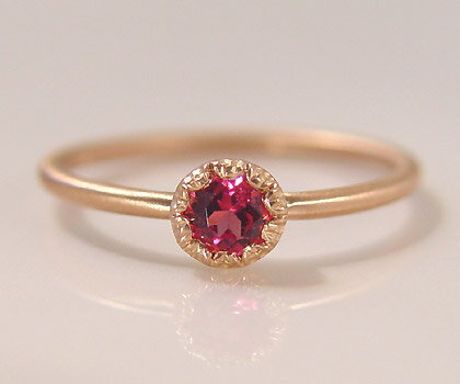 リング【levita-レヴィタ】は4mmのジュエルを1石だけ使ったシンプルなシルエット。非常に目の細かいマット仕上げで指通りが良く、さらりとした着け心地です。こちらには大人の女性らしさを感じさせる色味のルベライトをセットしました。 地金 K18 ピンクゴールド(画像サンプル品) PT900 K18 イエロー/ホワイト/ピンク K10 イエロー/ホワイト/ピンク 金種は上記からご選択頂けます 石 ルベライト (4.0mm) 1石 最大巾 約5.0mm 総重量 約1.57g(画像サンプル品,サイズ11号) コーティング ロジウム加工(ホワイトゴールドのみ) MR-6059 ※こちらのリングは幅が細いため、内側への文字入れ をお受けすることができません。ご了承ください。 楽天国際配送対象商品(海外配送) 詳細はこちらです。 Rakuten International Shipping Item (Since the end of June 2008) Details click here貴女が指先で触れて心地良く感じる質感はどういったものですか? 指先に直に触れるリングだから、その質感にはこだわりたいですよね。毎日着けたいお気に入りなら特に。 こちらの【levita-レヴィタ】は4mmのジュエルを1石だけ使ったシンプルなシルエットのリング。いつでも、どんなちょっとしたお出掛けにも着けていきたくなります。 こだわりの地金の質感は、非常に目の細かいマット仕上げ。指通りが良く、着けている事さえ忘れてしまいそうです。 軽快に、美しく、貴女の指先を飾りますよ。 ■RG0704 - K18 ルベライト リング 『levita』 ジュエルを1石シンプルに、そして丁寧にセットしたリング。 シルエットとしては細身で、そのぶん石の部分が際立って大きく見えます。 4mmのジュエルは輪郭を花びらで包んだようなイメージで留められており、ふんわりと優しい印象ですね。 地金はとてもきめ細かいマット仕上げ。ベタつかず、かといってザラザラしないサラっとした質感です。 指がするっと通り、着け心地も良いため、ずっと着けていたくなりますよ。 どこかクラシカルな雰囲気を醸し出しながらも重くならず、いつでも気軽にお使いいただけます。 ⇒拡大画像がご覧頂けます トルマリンの中でも、特に鮮やかな赤色の宝石を、ルベライトと呼んで区別しています。ピンクトルマリンよりも華やかな印象ですね。 花びらが包むような石座の中から溢れるような赤は、艶やかで大人の女性らしさを感じさせます。 クラシカルなイメージにのせたルージュのように鮮やかな赤で手元を飾りましょう。 側面 アームの太さは約1.4mm。丸線で一周均一の太さに仕上げられております。きめ細かなマット仕上げが美しい光沢を生み出しています。 宝石のアップ 鮮やかな赤の中にある落ちついた大人を感じさせる深み。花びらのような石枠に包まれるようにセットされています。 裏側 カップ状の石枠の下には光を通す穴が設けられています。アームの裏側は平らではなく、丸みを帯びています。 横から 丸いカップの上部、石枠の部分には繊細な装飾が施されており、それがクラシカルな印象につながっています。 >> 画像をクリックすると全て拡大画像がご覧頂けます。