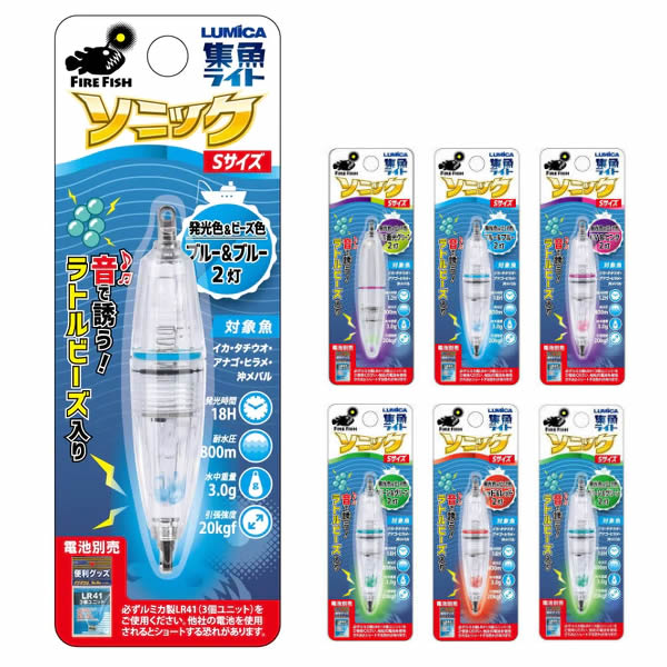 ルミカ 水中集魚ライト ソニック S (水中ライト 集魚灯 集魚ライト)■本体サイズ:φ16mm×79mm■重量(電池含む):12g■使用電池:ボタン電池LR41×3個※電池別売※ルミカ製電池をご使用下さい。■耐水圧:600m■水中重量:0.8号相当(約3g)■引張強度:20kgf■カラー:(水中ライト発光色)&(ビーズ色)の組み合わせとなります。■連続使用時間:ブルー・グリーン・レッド:約18時間UV:約12時間※上記は新品電池を使用した際の目安となります。 ≪ルミカ 水中ライト 集魚灯 集魚ライト≫●集魚ラトルビーズ内蔵。●光と音で寄せる新感覚の水中ライトが登場。●フォール中やシャクリを入れた後のアクション中に内蔵のラトルビーズが動き、今までの水中ライトには無い「音」の要素で周囲の魚に猛アピール。●水中ライト本体も点灯パターン4種類搭載で多彩な攻め方が可能。●耐水圧600mの高耐久性+軽量ボディの両立を実現。●船釣り全般から堤防のウキ釣り・サビキ仕掛まで幅広い釣り方に対応。 ●「在庫有り」の表示であっても、必ずしも在庫を保証するものではありません。掲載商品につきましては、各モール及び実店舗と在庫を共有しております。完売や欠品の場合は、誠にご迷惑をお掛けいたしますが、御注文をキャンセルさせていただく場合がございます。予めご了承ください。●商品画像は代表画像の場合もございます。商品名等をご確認の上ご購入ください。また、仕様変更により商品スペックやパッケージ、内容量などが変更となる場合がございます。仕様変更に伴う返品、商品交換の際の往復送料はお客様ご負担となります。予めご了承ください。集魚ラトルビーズ内蔵。光と音で寄せる水中ライト。